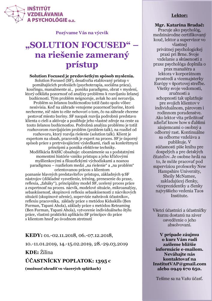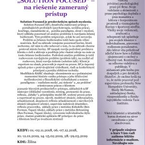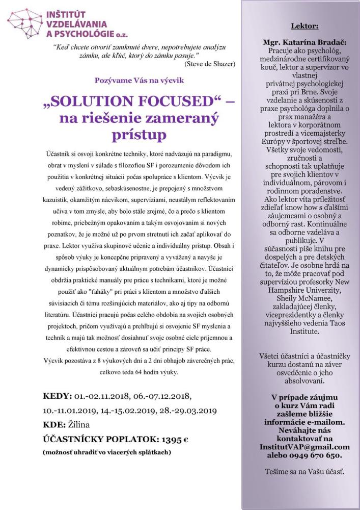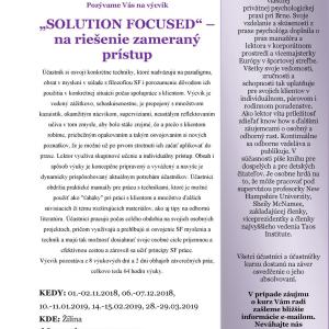 Solution Focused v Žiline. Výcvik je vedený zážitkovo, sebaskúsenostne, je prepojený s množstvom kazuistík, okamžitým nácvikom, supervíziami, neustálym reflektovaním učiva v tom zmysle, aby bolo stále zrejmé, čo a prečo s klientom robíme, priebežným opakovaním a takým osvojovaním si nových poznatkov, že je možné už po prvom stretnutí ich začať aplikovať do praxe. Účastník si vytvára svoj vlastný štýl práce a osvojuje umenie reflexie svojej práce.